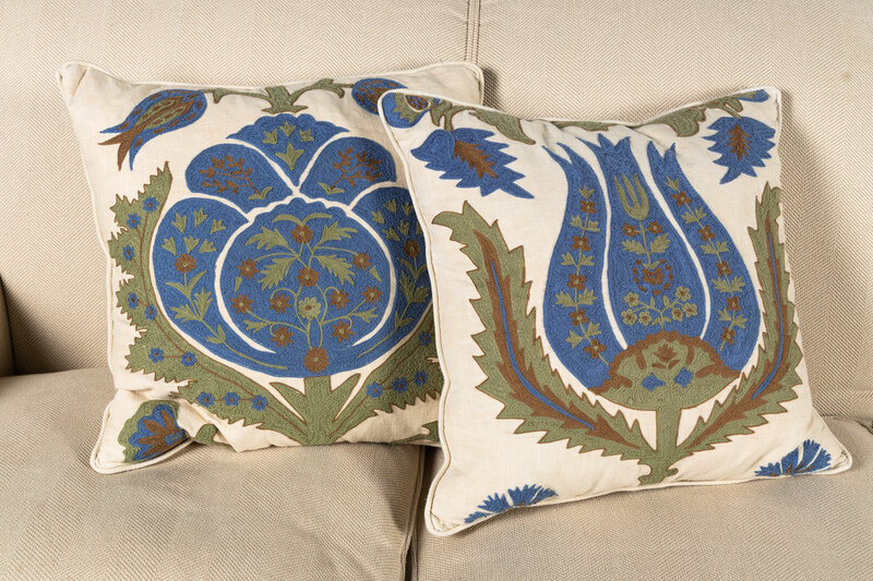 down-filled, with herringbone upholstery and Brunschwig and Fils Flowers of Jamakhana trim and throw pillows.