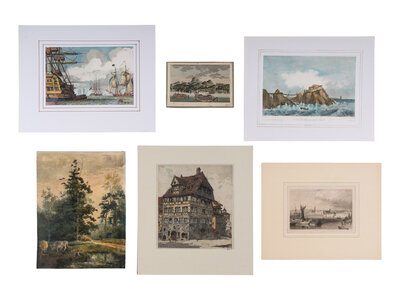 Together, approximately 17 works, primarily engraved prints, many with hand-coloring. Various artists and publishers, various dates spanning approximately ca 1600s-1900s, each18 x 24-in. or smaller. Condition varies but is generally good (a few sheets with some toning and soiling, many with chipping to edges or short tears). Many matted, one matted & framed (unexamined out of frame).