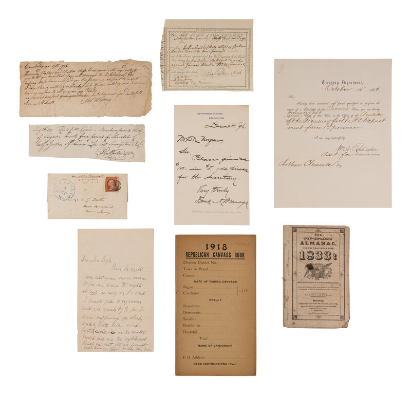 And others. Together, approximately 31 works, primarily printed documents, various dates spanning approximately ca 1700s-1900s, various sizes. Condition varies but is generally good (many disbound, a few with some toning and soiling, many with chipping). Complete list available upon request.