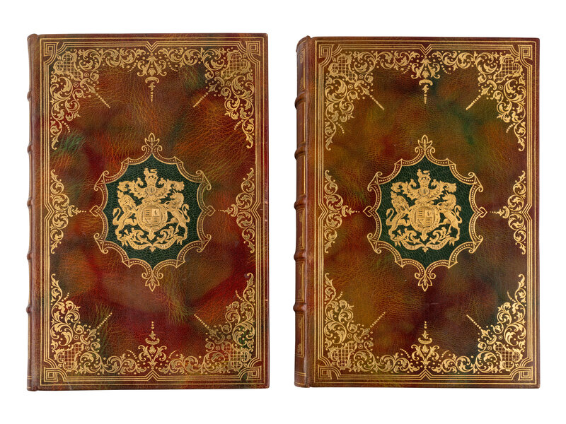 2 volumes (of 37). 8vo (213 x 140 mm). Numerous hand-colored photographic illustrations. Contemporary polished Spanish calf gilt surrounding a central green morocco and gilt inlaid coat of arms, top edge gilt, turn-ins gilt, white inlaid pigskin doublures gilt (rubbing, light sunning to spines, silk ribbons detached but present).