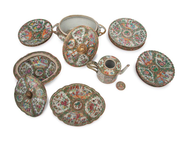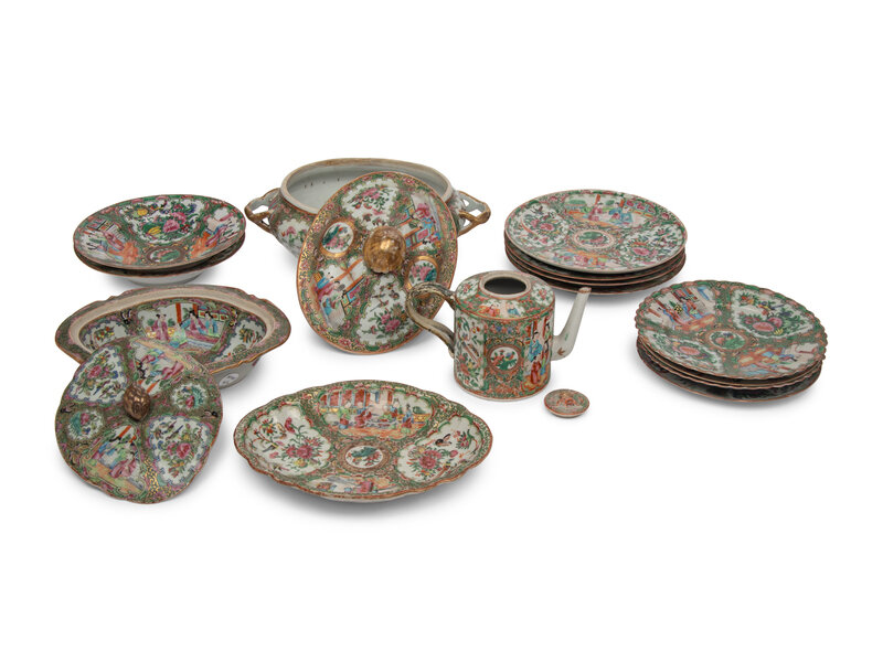 comprising a soup tureen and cover, an entree dish and cover, an open serving dish, a teapot and ten plates of varying size and form; 14 items total.