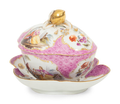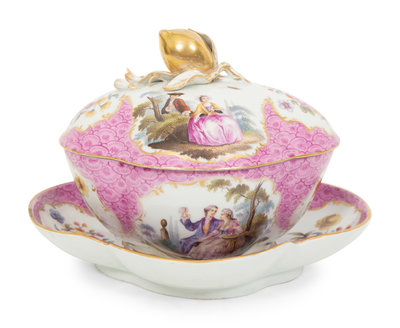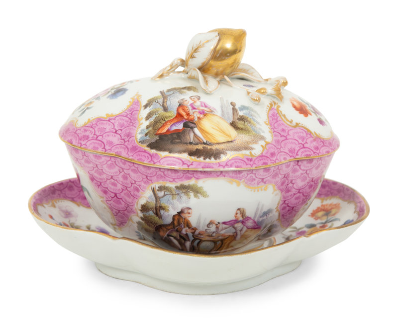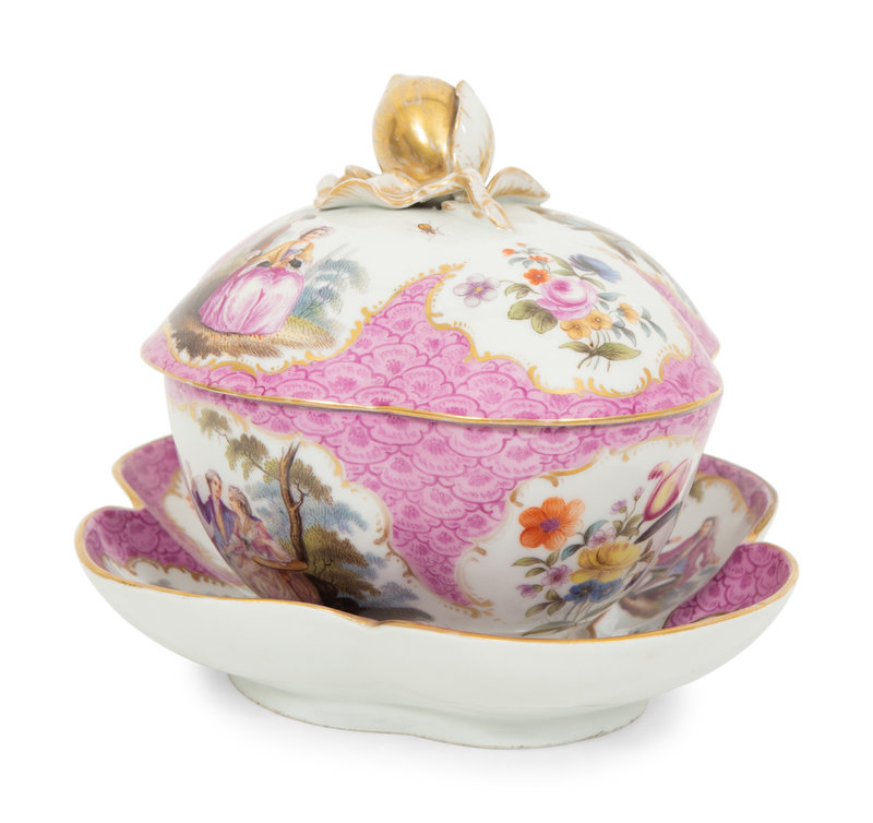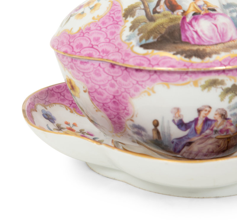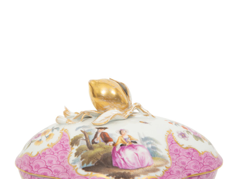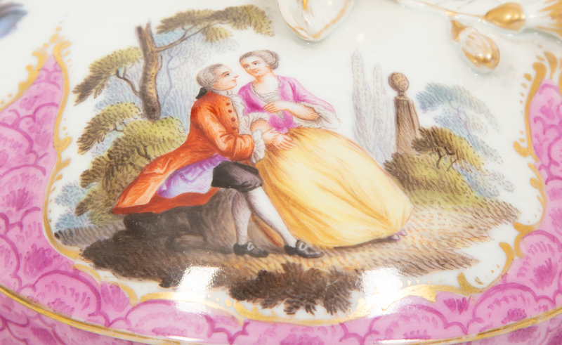 polychrome painted with scenes after Watteau and having a lemon knop.