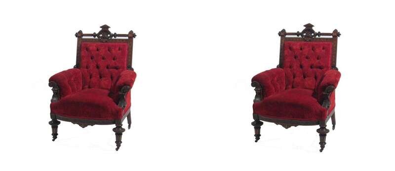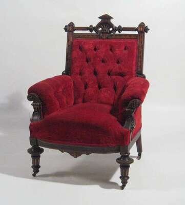 With carved and turned crest rail with inlay and gilt decoration surmounting a tufted back; square upholstered seat flanked by scrolled arms with carved ends above a carved apron, resting on turned and carved legs, terminating in casters.