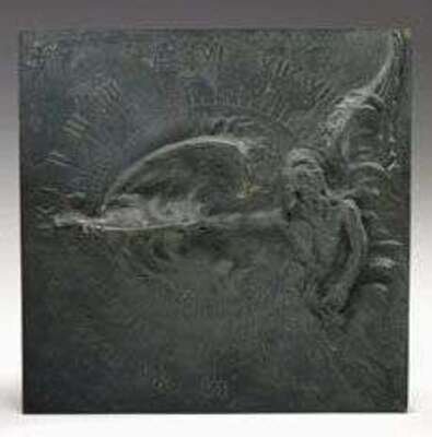 The cast figure of a winged Father Time holds an hour glass in his left hand and the right hand holding a scythe which forms the gnomon for the sundial; the face engraved with Roman numerals, the lower section engraved, "Art is long and time is fleeting 'Longfellow/Copyright 1916 by Louis F. Ragot' lower right.