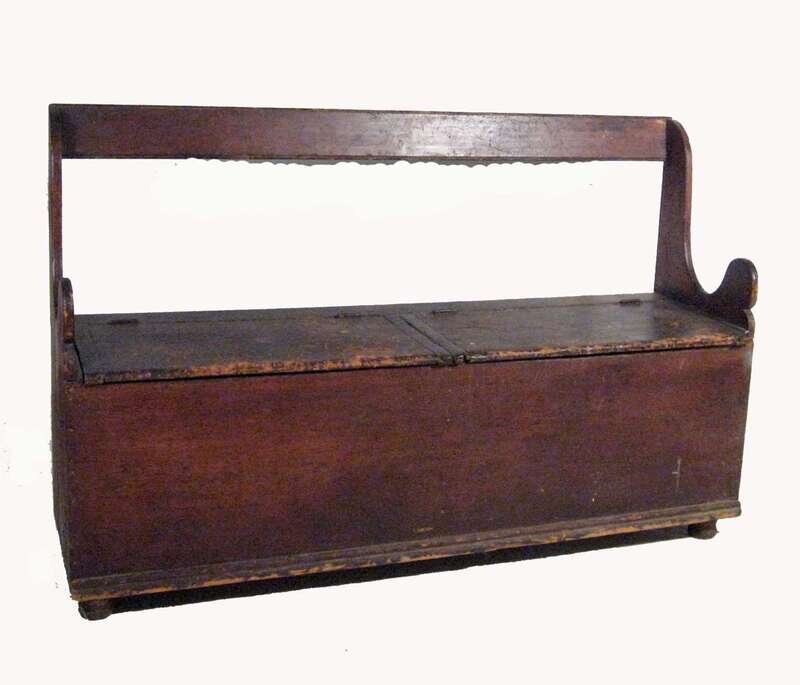 The shaped ends joined by straight back rest above seat fitted with two hinged panels that lift on rectangular case raised on turned feet.
