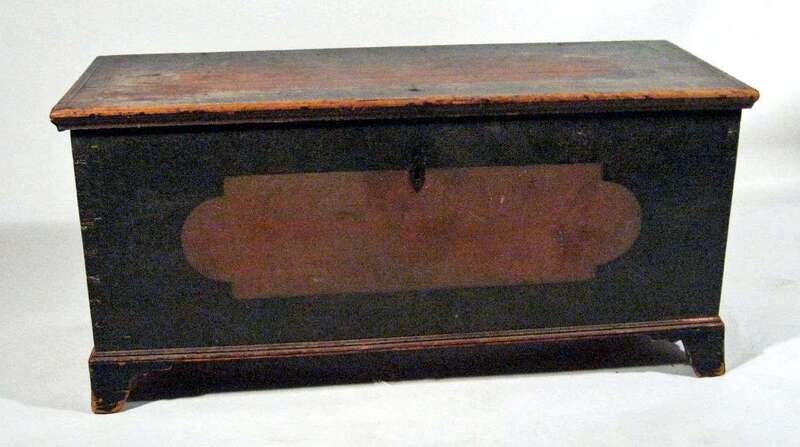 The molded rectangular hinged lid lifts to well above case painted with shaped reserve on flared bracket feet.