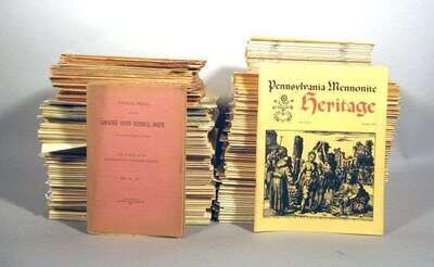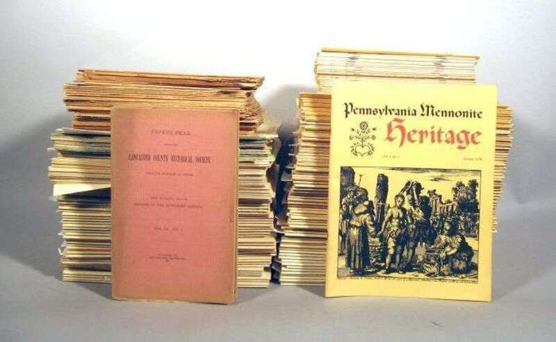 Pennsylvania German Periodical, Historical Society & related publications: Lancaster County Historical Society. Papers Read Before The... Lancaster, 1904-1912, vol. 3, nos. 8 & 9; vol. 4, nos. 1-2, 5-9, vol. 5, nos. 1-7; vol. 6, vos. 1, 5-8; vol. 7, nos. 1, 4-7, 9-12, vol. 10, no. 4; vol. 14, no. 8; vol. 16, no. 5. 38 vols., 8vo, orig. wrappers; scattered light to moderate wear & dust soiling. * Pennsylvania Mennonite Heritage. Lancaster, 1978-2005. Vol. 1, no. 1 - vol. 28, no. 1. Virtually complete run thus, with index vol. for vols. 1-5 only, vol. 4, nos. 2-4 only, no. 1 in facs. 109 vols. 4to, orig. wrappers. * Mennonite Research Journal. Lancaster, 1970-1977. Vols. 11-18 + index. 33 vols., orig. wrappers. * The Mirror. Lancaster Historical Society, 1973-2001. Incomplete run. 4to, wrappers. * Rush, Benjamin. An Account of The German Inhabitants of Pennsylvania. Lancaster, 1910. 8vo, orig. gilt-lettered blue cloth, t.e.g.; edge wear. Plates. Some internal dampstaining.