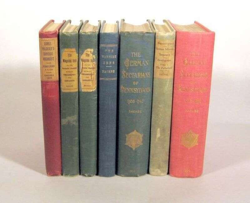 Sachse, Julius F.: The German Sectarians of Pennsylvania, 1708-1742; 1742-1800. 2 vols. Married set: Vol. 1: Philadelphia: Printed for the author, 1899. 1st ed., #8/350; vol. 2: Philadelphia: (P.C. Stockhausen), 1900. #259/300. 1st ed. Lg. 8vo, vol. 1: orig. green cloth, new endpapers; light rubbing to corners, small tears & wear to spine; Vol. 2: orig. red cloth. Frontispieces., plates & text illus. Slight browning to text. * The Fatherland. Showing The part of Bare in The Discovery, Exploration and Development of The Western Continent. Philadelphia: Penn. German Society, 1897. 1st ed. #106/150. 8vo, orig. green cloth; some dampstaining & soiling, corners lightly rubbed, hinges splitting. Frontis., plates, text illus. Light browning to text. * The Wayside Inns on The Lancaster Roadside between Philadelphia and Lancaster. Lancaster: The New Era Printing Co., 1915. 2nd ed. 8vo, modern blue-green cloth, new endpapers. Frontis., plates, full & text illus. Some foxing to text. Former owner's inscription. * Another copy of the preceding, orig. green cloth; front hinge splitting, corners slightly rubbed, some spine wear, spine label chipped. Frontis., plates, full & text illus. Endpapers & frontis. becoming detached, scattered browning & light foxing to text. Forner owner's inscription on front free endpaper. * Another copy of the preceding, orig. green cloth; front hinge loose, staining & other wear to covers, light rubbing to corners & spine. Frontis., plates, full & text illus. Scattered browning & light foxing. Bookplate stain to front paste-down. * (Sasche, Julius F. ,editor.) Falkner's Curieuse von Pennsylvania. Philadelphia: Printed for the author, 1905. 1st ed. 1/250, out-of-series copy. 8vo, orig. red cloth; corners bumped, minor wear to top & bottom of spine. Frontis., plates, maps, text illus. Slight browning to text. Ex-library copy - stamps & other markings on front paste-down & front matter.