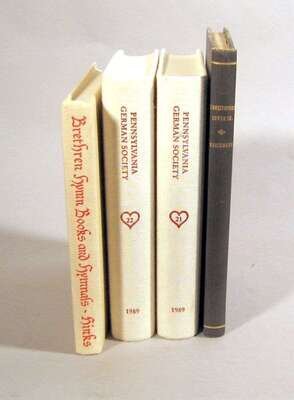 Books on Pennsylvania Books: Arndt, Karl, John, Richard, et al., editors and compilers. The First Century of German Language Printing in The United States of America. Gottingen, 1989. 2 vols. 4to, orig. white cloth; light wear; occasional dust soiling. Plates. Internally generally clean. * Hinks, Donald R. Brethren Hymn Books and Hymnals, 1720-1884. Gettysburg: Brethren Heritage Press, [1986]. 1st ed. Sm. 4to, orig. beige cloth; light to moderate dust soiling. Illus. Presentation copy, signed and inscribed by the author on front free end paper. * Thomas, Wilbur K.; Reichmann, Felix, editors. Bibliographies on German American History, No. 2. Christopher Sower, Sr. N.p., n.d. [ca. 1945]. 8vo, contemp. blue buckram; light wear. Typescript.