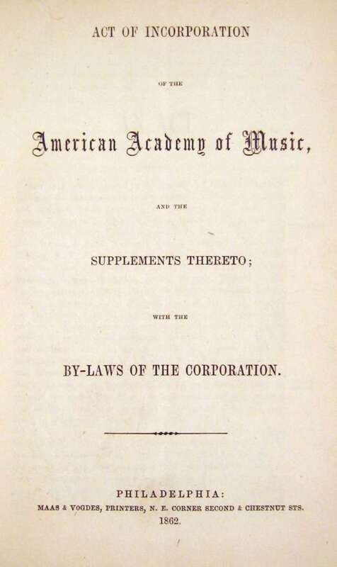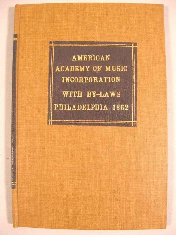 American Academy of Music. Act of Incorporation... Supplements... By-Laws of The Corporation. Philadelphia, 1862. 8vo, modern cloth, black morocco labels.