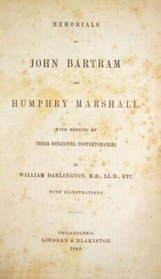 Darlington, William. Memorials of John Bartram and Humphrey Marshall with Notices of Their Botanical Contemporaries. Philadelphia: Lindsay and Blakiston, 1849. 1st ed. Thick 8vo, modern black buckram. Frontis., facs., text illus. Scattered light foxing, light to moderate foxing to title page. With 3 pp. autograph letter signed by Anna Maria Collinson (great grand daughter of Peter Collinson, one of Bartram's botanical correspondents), to the author, 14 May 1850, giving family history, tipped in.