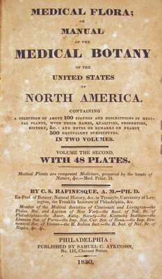 Rafinesque, C.S. Medical Flora; or Manual of The Medical Botany of The United States of North America. Philadelphia: Samuel C. Atkinson, 1830. First edition. Vol. 2 (of 2) only. 12mo, contemp. speckled sheep, morocco spine label; scuffed, joints & extremities rubbed, front joint tender. With 48 (nos. 53-100) wood-engraved plates printed in green. Scattered light foxing, some discoloration to front matter.