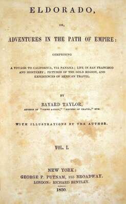 Taylor, Bayard: Eldorado, or, Adventures in The Path of Empire:... A Voyage to California. New York: George P. Putnam, 1850. First edition. 2 vols. 12mo, orig. blind-stamped green cloth, gilt-lettered spine; light wear. With 8 tinted lithographic plates. Scattered light to moderate foxing, vol. 2 title page & front matter perhaps more than moderately foxed, minor occasional dampstaining. 45 pp. adverts. Signed and dated, "New York, 1850," by Bayard Taylor on front free endpaper recto. In custom green cloth slipcase & sleeve. BAL 196388, state B of adverts. * The second edition of the preceding, New York: G.P. Putnam's, 1850, 2 vols., 12mo, orig. green cloth, gilt-lettered spine, 8 tinted plates, 12 pp. adverts., internally generally clean. In custom cloth & bds. slipcase.
