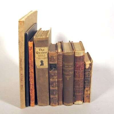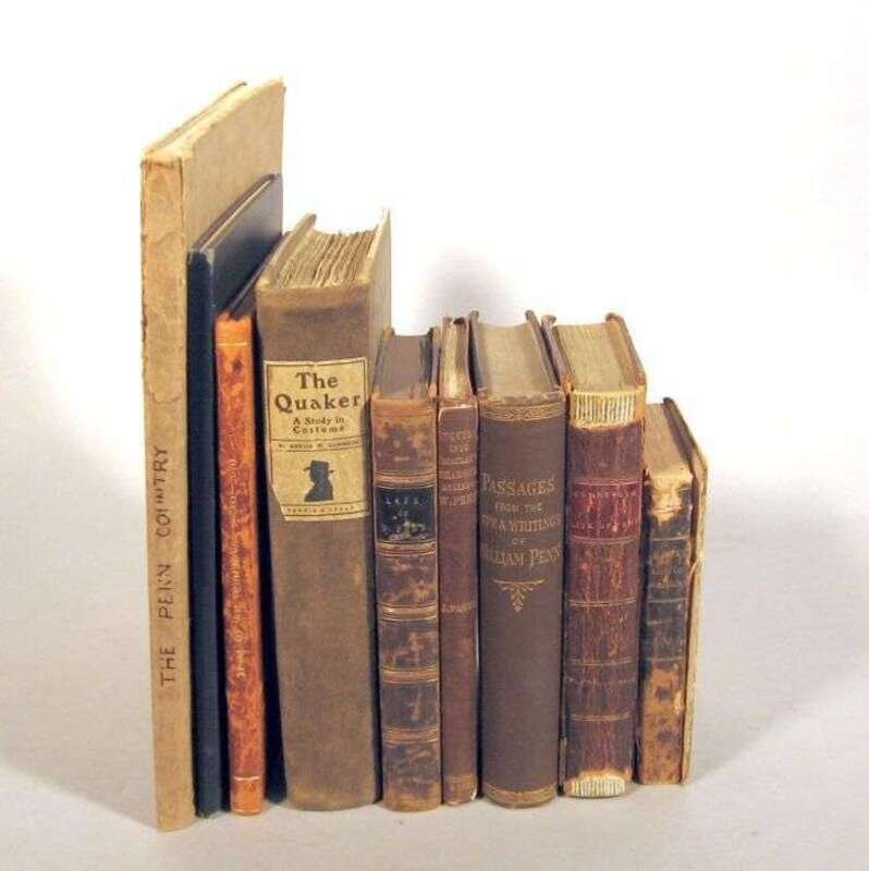 William Penn and Related Subjects: Frost, John. The Life of William Penn,... Early History of Pennsylvania. Philadelphia, 1839. 1st ed. 24mo, contemp. sheep; rubbed and worn, cover detached. Frontis., wood-engraved text illus. Scattered light to moderate foxing. * Clarkson, Thomas. Memoirs of The Public and Private Life of William Penn. London, 1849. 12mo, contemp. 1/4 calf & cloth, morocco spine label; joints and corners rubbed. Frontis., 2 fold. maps (Philadelphia & Pennsylvania); close tear to Phila. map. Scattered spotting. * Paget, John. An Inquiry Into The Evidence... Charges... Lord Macaulay Against William Penn. Edinburgh: W. Blackwood and Sons, 1858. Sm. 8vo, orig. brown cloth, spine gilt; some chipping to spine and joints. * Passages from The Life and Writings of William Penn. Philadelphia: Friend's Bookstore, 1882. 12mo, orig. brown cloth; light wear. * Trial of William Penn and William Mead at The Old Bailey, 1670. London: Headley Brothers, [1908]. Sm. 4to, contemp. 3/4 brown morocco and marbled bds.; scuffed, joints and extremities rubbed. * The Charter of Liberties from William Penn to The Freemen of The Province of Pennsylvania. Philadelphia, 1909. Sm. 4to, gilt-lettered & decorated blue cloth; slightly scuffed. Ink stamp on front free endpaper. * Gummere, Amelia Mott. The Quaker: A Study in Costume. Philadelphia: Ferris and Leach, 1901. 1st ed. 8vo, orig. 1/2 suede & bds., paper spine label; a little scuffed. Plates (1 sprung). * The Penn Country of Buckinghamshire. [London], n.d. [ca. 1920]. 4to, orig. stiff wrappers, cover label; some edge wear and creasing. Photo plates, maps, text illus.