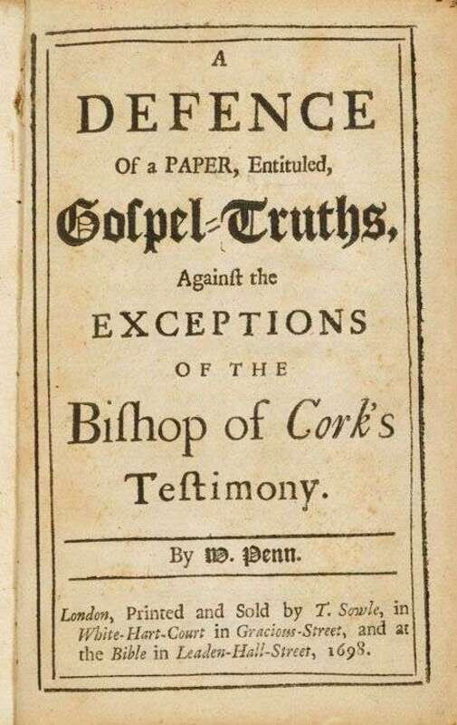 Penn, W(illiam). A Defence of a Paper Entitled Gospel-Truths Against The Exceptions of The Bishop of Cork's Testimony. London: T. Sowell, 1698. First edition, mixed. 8vo, contemp. paneled calf, morocco spine label; edges occasionally rubbed, joints slightly stressed. Internally generally clean. Armorial bookplate on front paste-down.