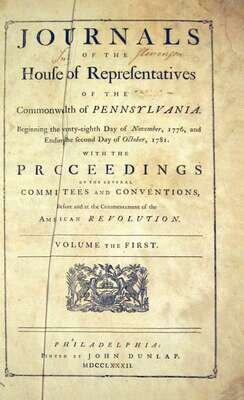 (Pennsylvania, State.) Journals of The House of Representatives of The Commonwealth of Pennsylvania. Beginning The Twenty-Eighth Day of November, 1776, and Ending The Second Day of October, 1781. With The Proceedings... Committees and Conventions, Before and at The Commencement of The American Revolution. Philadelphia: John Dunlap, 1782. Volume The First. Folio, contemp. (orig.?) sheep & bds.; rubbed, worn & blistered. Scattered internal light foxing & occasional, mostly minor, soiling. Untrimmed. Includes printing of The Declaration of Independence.