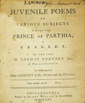 (Early American Theatre.) Godfrey, Thomas, Jr. Juvenile Poems on Various Subjects. With The Prince of Parthia, A Tragedy. Philadelphia: Henry Miller, 1765. 4to, contemp. sheep; rubbed, worn & blistered, covers detached but present. Early owner's ink manuscript & stamped signatures at head of title, early 20th-Century ink owner's signature & inscription at foot of title page. Some internal dampstaining & spotting, horizontal tear across leaf G1, tears at top margin of leaf N2, lower blank bottom fore-edge corner torn away, upper blank fore-edge corner of leaf Bb2 & Bb3 worn away. (1)-xxvi, (2), 1-223 pp., free endpapers detached but present.