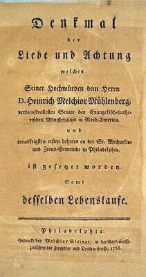 (Helmuth, Justus Henry Christian.) Denkmal der Liebe und Achtung Welches Seiner Hochwurden dem Hern D. Heinrich Melchoir Muhlenberg. Philadelphia: Melchoir Steiner, 1788. First edition. 8vo, orig. speckled wrappers; spine mostly gone. Frontis. portrait of Muhlenberg. Some dampstaining to back wrapper & back matter, offsetting on title page, some toning throughout. In worn & soiled cloth case.