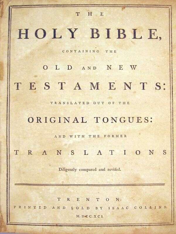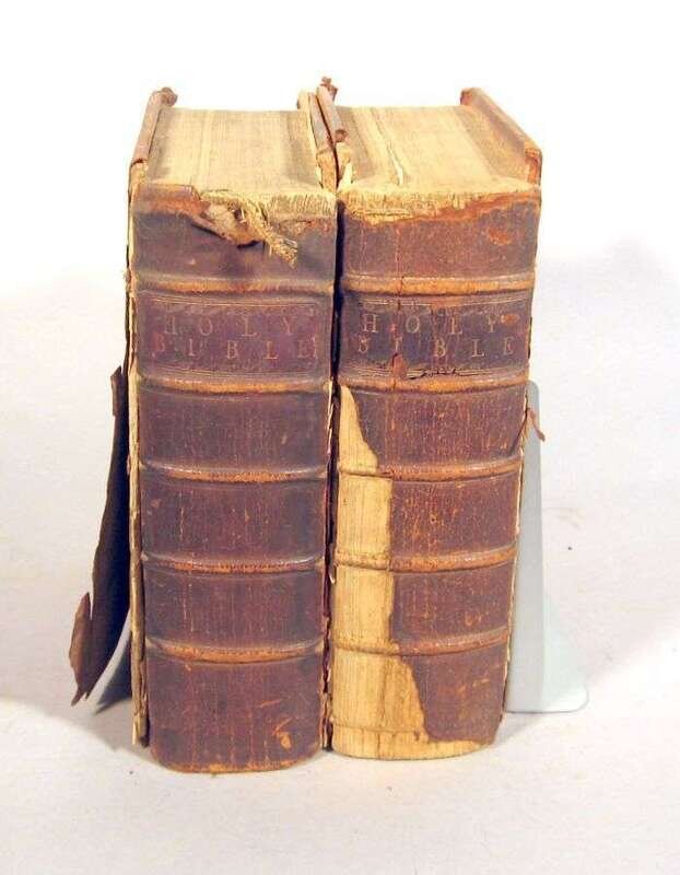(Bible in English.) The Holy Bible... Trenton: Isaac Collins, 1791. 4to, contemp. blind-paneled calf; rubbed & worn, covers detached, spine defective, scattered internal dampstaining and browning. Some chipping to margins of Concordance. Bound without "Practical Observations." 18th and 19th-Century Shoemaker family manuscript records. * Another copy of the preceding, 4to, contemp. blind-paneled calf; worn and rubbed, cover detached, slight to moderate foxing, front blanks detached, lacking last four leaves of the Concordance, bound without "Practical Observations." Shoemaker and related family manuscript records.
