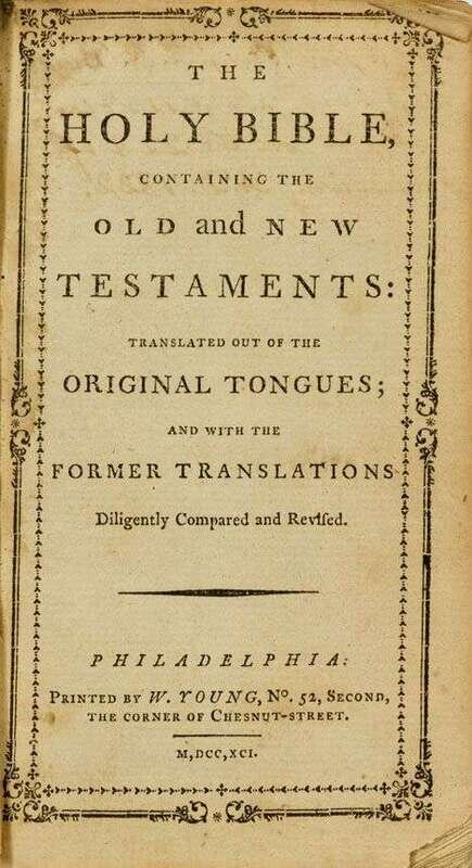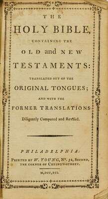 The Holy Bible. Philadelphia: W. Young, 1791-92. 12mo, contemp. red straight-grained morocco, black morocco spine label, gilt, a.e.g.; front cover detached. 2 vols. in 1, with New Testament title page, Philadelphia: W. Young, 1792, with 2 pp. table following N.T. With Clement Biddle ms. family records on front page.