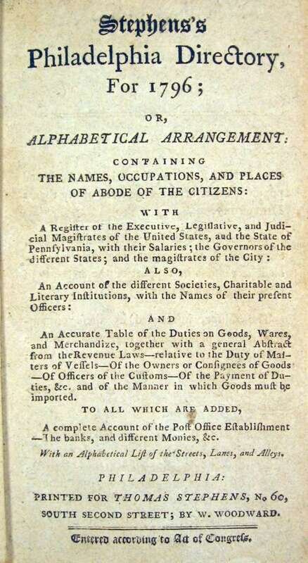 Stephens, Thomas.Stephens's Philadelphia Directory for 1796. Philadelphia: printed for Thomas Stephens, [1796]. 12mo, slightly later 1/2 brown calf & marbled bds.; scuffed, joints, spine ends & corners rubbed. Internally clean. With the 2 pp. of adverts. Lacking plan.
