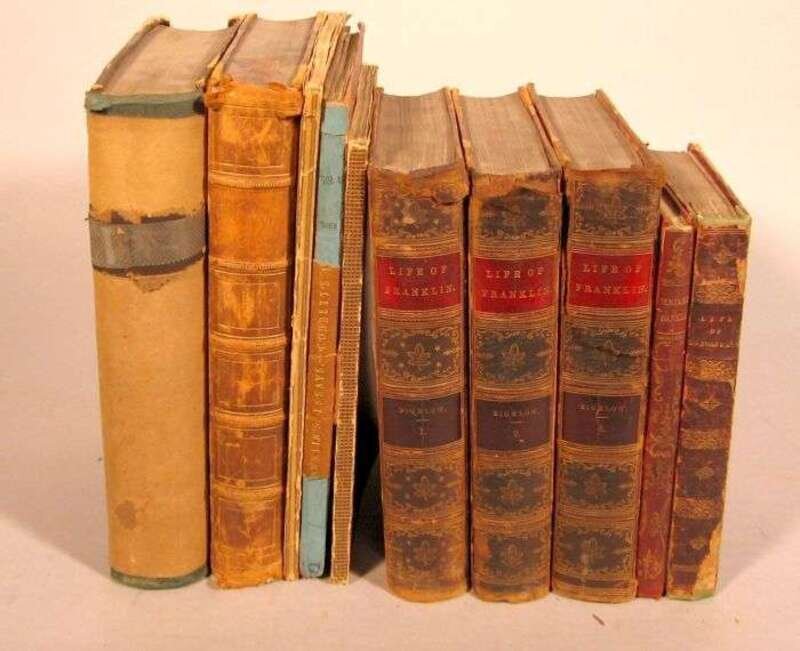 Franklin, Benjamin: The Life... The War of Independence... Negotiations at Paris... History of His Political and Other Writings. London: Hunt and Clarke, 1826. 12mo, contemp. red straight-grained morocco, gilt; rubbed and worn. Not recorded by Ford. * The Works... Essays... With His Life. London: J. Limburd, 1824. 8vo, later wrappers. Some internal staining. Lacking original Limburd's British Classics front wrapper. Ford 494. * The 1830 Limburd printing of the preceding, 8vo, contemp. cloth; spine defective. Not recorded by Ford. * The Life of... Also The Miscellaneous Writings... Edinburgh, 1838. People's Edition. 8vo, later wrappers. Slightly toned. Lacking original covers. Ford 518. * The Autobiography... Edited by Jared Sparks. London: H. G. Bohn, 1850. 12mo, orig. publisher's red straight-grained, morocco, spine gilt; parts of spine detaching, other wear. Lacking front free endpaper. Ford 414. * Autobiography. New York: Harper, 1856. 8vo, contemp. 1/2 calf and marbled bds.; rubbed. Frontis., text illus. See Ford 413. * The 1859 New York: Harper ed. of the preceding, 8vo, orig. cloth, spine mostly gone, frontis., text illus. * The Life of Benjamin Franklin. Philadelphia: J. B. Lippincott, 1874. 1st ed. thus, edited by John Bigelow. 3 vols. 8vo, contemp. 3/4 tan calf, marbled bds. & edges, spines gilt, morocco spine labels; rubbed, spine ends rubbed away or detaching, front hinges broken. Frontis. portrait. Ford 424.
