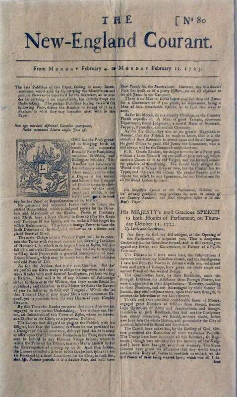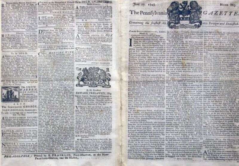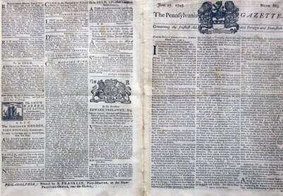 Benjamin Franklin: "The Pennsylvania Gazette." Philadelphia: B. Franklin, June 27, 1745. Number 836. 4 pp., small folio. Generally clean, repaired along center fold. * "The New England Courant." Boston: B. Franklin, Feb. 4 - Feb. 11, 1723 [but n.p., 1856]. 2 pp., sm. folio. Facsimile of the first newspaper printed by B. Franklin, printed in 1856 on press once owned by him. Generally clean. * Engraved map. "Map of Cumberland and Franklin." Engraved by W. Keenan... for Ramsey's Annals of Tennessee [ca. 1853-1860]. 8 1/2 x 17 inches (216 x 430 mm). Clean. All framed.