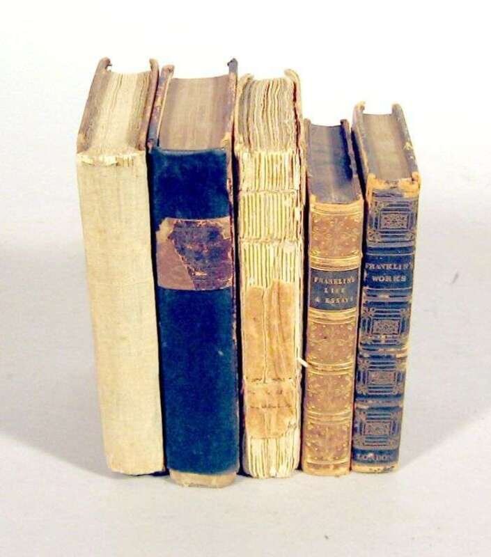 Franklin, Benjamin: The Works. Edinburgh: Oliver & Boyd, 1812. 2 vols. in 1. 12mo, contemp. black straight-grained morocco; rebacked and repaired with mid 19th-Century cloth, cover detached. With 2 frontispieces (including portrait). Minor internal staining. Ford 468. * The London: J. Walker, 1819 ed. of the preceding, 24mo, orig. printed bds.; spine gone, covers detached, scattered dust soiling, engraved frontis. and additional vignette title, untrimmed. Ford 489. * The London: W. Baynes, 1824 ed. of the preceding, 24mo, contemp. straight-grained purple morocco, gilt; joints and extremities rather rubbed. Engraved frontis. and additional vignette title. Ford 466. * The Halifax: William Milner, 1837 ed. of the preceding, 24mo, contemp. 1/2 tan calf & marbled bds., spine, morocco spine label; joints and extremities heavily rubbed. Frontis portrait. See Ford 517. * The Halifax: William Milner, 1844 ed. of the preceding, 24mo, orig. brown cloth; spine detached but present, edge wear. Engraved frontis. and additional vignette title. Not recorded by Ford.
