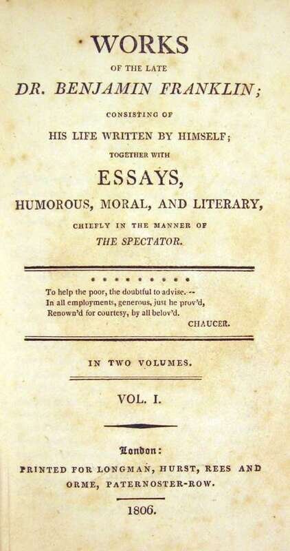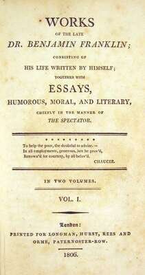 Franklin, Benjamin: Works of The Late Dr. Benjamin Franklin... Together with Essays... London: Longman, Hurst, Rees, and Orne, 1806. 2 vols. 12mo, orig. bds.; worn, rebacked in later 19th-Century cloth. Portrait frontis. Scattered light foxing. Some old ink marginal annotations. Untrimmed. Ford 464. * The 1st vol. of the preceding, contemp. marbled bds.; rebacked in 19th-Century cloth. Portrait. Trimmed, clean. * The London: T. Kinnesley, 1816 ed. of the preceding, 8vo, contemp. tree calf; worn and rubbed, rebacked with later 19th-Century cloth. Frontis. portrait, engraved vignette title page, some spotting to front matter. Ford 481 (calling for 464 pp. - above copy with 471 pp.).