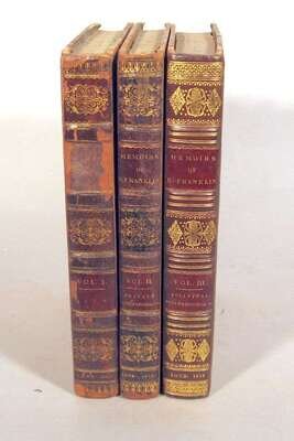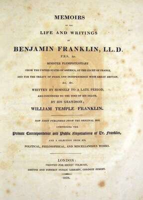 Franklin, Benjamin. Memoirs of The Life and Writings of Benjamin Franklin. London: for Henry Colburn, 1818. 1st ed., edited by William Temple Franklin. 4to, contemp. full diced gilt-paneled calf, gilt-paneled spines, marbled edges, new morocco spine labels (1 detaching); rebacked, orig. spines laid down scuffed, occasionaly rubbed. With portrait facsimile & 7 plates (including fold. plates). Scattered light foxing. Lacking terminal blanks in vol. 1. This is the first publication of the autobiography as written by Franklin and of the third part in any form.