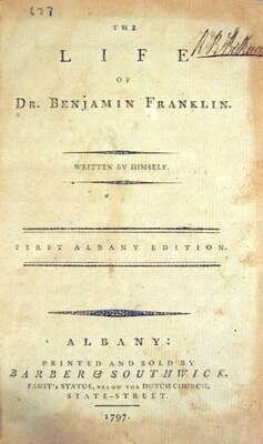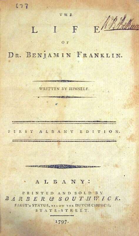 Franklin, Benjamin. The Life of Dr. Benjamin Franklin. Albany: Barber & Southwick, 1797. First Albany ed. 12mo, contemp. tree sheep, red morocco spine label; scuffed, extremities rubbed, front cover detached. Adverts. Minor scattered internal spotting.