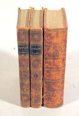 Franklin, Benjamin. Works of The Late Doctor Benjamin Franklin. London: G. G. J. and J. Robinson, n.d., [1794]. Third edition. 2 vols. 12mo, contemp. speckled calf, spines gilt, black morocco spine labels; rubbed, front covers detached. Title vignette portrait of Franklin. Moderate foxing to t.p., vol. 2 t.p. trimmed at fore-edge. * Another copy of the preceding, 2 vols. in 1, later 19th-Century morocco & cloth; rubbed. Early owners signature at head of vol. 1 t.p. The first edition was issued in 1793.