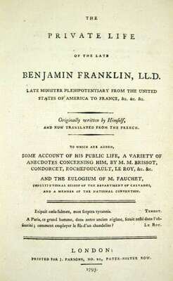 Franklin, Benjamin. The Private Life of The Late Benjamin Franklin... Originally Written by Himself, and Now Translated from The French... London: for J. Parsons, 1793. 8vo, later 1/4 tan calf & marbled bds., red morocco spine label; joints & extremities scuffed. Internally generally clean.