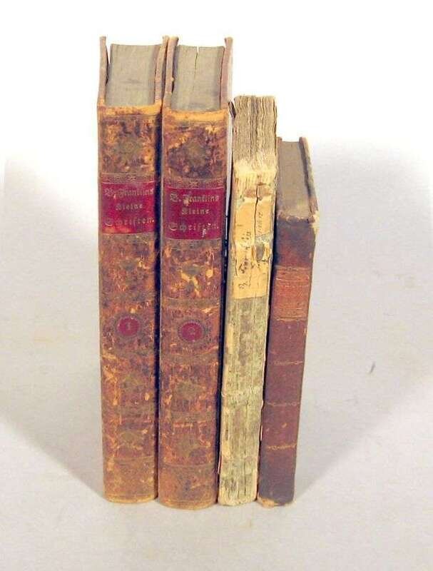 Franklin, Benjamin - 18th-Century German Imprints: Benjamin Franklin's Jugendjahre. Berlin: H.A. Rottman, 1792. 12mo, orig. wrappers; moderately worn. Some internal creasing. Old library stamp excised from t.p. - no loss of printing. Some internal spotting. Untrimmed. Ford 384, "contains only the first part of [Franklin's Autobiography]." * Another copy of the preceding, contemp. 1/2 calf & marbled bds.; extremities rubbed. Trimmed. * Benjamin Franklins Kleine Schriften. Weimar, 1794. 2 vols. 12mo, contemp. tree sheep, spines gilt, red morocco spine labels; extremities rubbed. Frontis. portraits. Scattered light foxing. Ex-library - ink stamp on t.p. Ford 444.