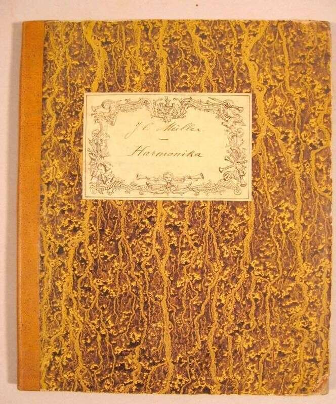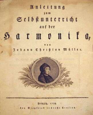 (Franklin, Benjamin.) Muller, Johann Christian. Anleitung zum Selebstunterrkht aus der Harmonika. Leipzig, 1788. First edition. 4to, 19th-Century calf-backed bds.; occasionaly scuffed. Title vignette portrait of Franklin. Some dampstaining to edges of t.p. & front matter letter press text of music.