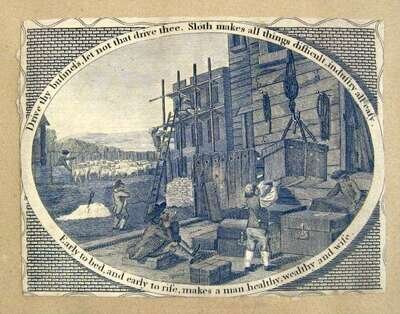 (Franklin, Benjamin.) [Bowles's Moral Pictures, or Poor Richard Illustrated, Being Lessons for The Young and Old, On Industry, Temperance, Frugality by The Late Dr. Benjamin Franklin.] [London: Bowles and Carver?], no date, [circa. 1796]. 24 (of 25) oval vignettes of maxims, each individually excised & mounted to small oblong folio leaf. Small oblong folio, orig. bds. Without title & "imprint".