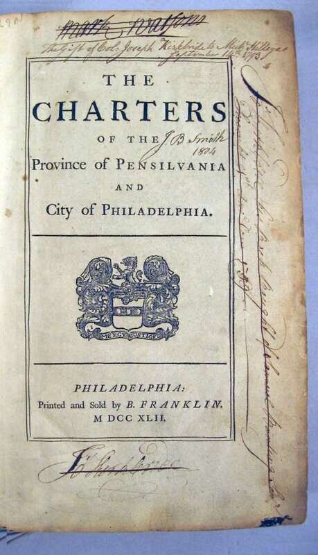 (Franklin, Benjamin, Printer.) The Charters of The Province of Pennsylvania and City of Philadelphia; A Collection of All The Laws of The Province of Pennsylvania Now in Force: An Appendix [of Laws]... Formerly in Force... Philadelphia: Sold and Printed by B. Franklin, 1742 [but 1743]. 3 parts in 1 vol. Folio, contemp. full blind-tooled calf, gilt-lettered morocco spine label; scuffed, extremities heavily rubbed, covers detached or detaching. Front free endpaper detached. Some dampstaining to margins of Appendix. 18th & 19th-Century ink ownership inscriptions on title page & head of p. 3. Mispaginations corrected in old ink. Likely bound by Joseph Goodwin, Philadelphia, with double blind fillet cover panels, likely Miller Roll no. 23 along spine sides, Miller gilt spine label no. 1. Ex library copy - paper labels on back paste-down & bottom of spine.