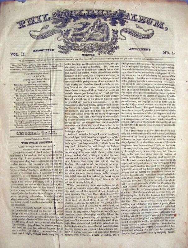 Philadelphia Album, Ladies' Literary Gazette. (Philadelphia), [1827-28]. Vol. II, nos. 1-40. Sm. folio, contemp. 1/4 morocco and marbled bds. Early owner's gilt-lettered red morocco labels on front cover. Wood-engraved vignettes. Scattered light foxing, minor chipping to head of no 1.