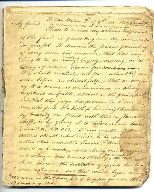18th & 19th-Century Manuscript Material & C. - Primarily Relating to Pennsylvania: Manuscript. Watson, John "Observations on The Customary Use of Distilled Spiritous Liquors." N.p., ca. 1809. Sm. 4to, unbound. 40 pp. * Ms. material relating to the preceding. * Ms. copy of the Will of Anthony Kimble... of Buckingham. 1796 or slightly later. * Indenture on parchment, Burks [sic] County. 1728. * Lot also includes 19th-Century indentures, partly-printed documents, letters. * Union Canal Company of Pennsylvania coupon certificate 1857.