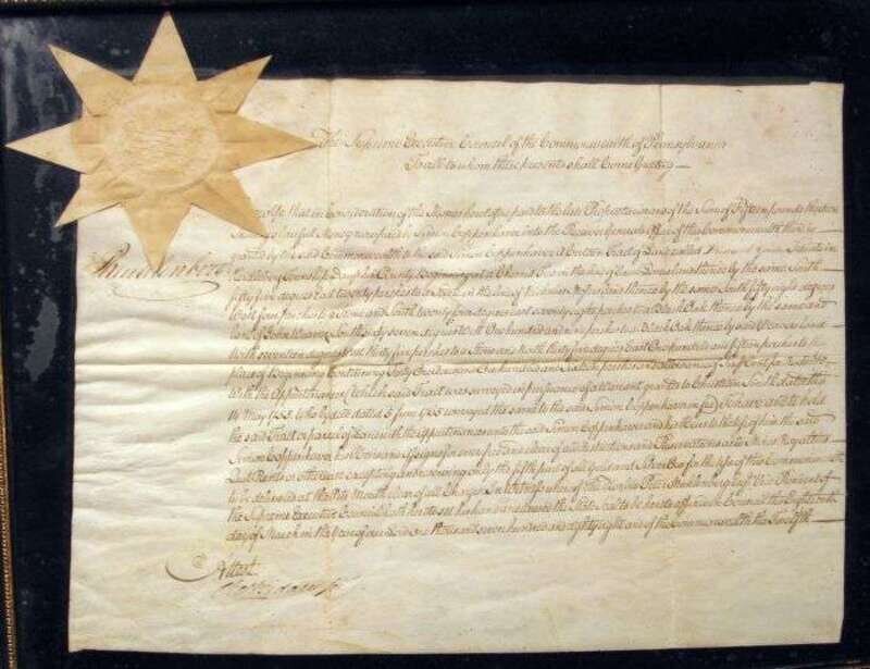 Manuscript Document Signed. Muhlenberg & [John] P(eter Gabriel). [Philadelphia?], March 18, 1788. 1 p., folio, on vellum, with paper seal. Countersigned by Chas. Biddle, Sect. Land patent in Dauphin County to Simon Coppenhaver. Clean & bold. Framed. Signed by Muhlenberg as Vice President of The Supreme Executive Council of Pennsylvania.