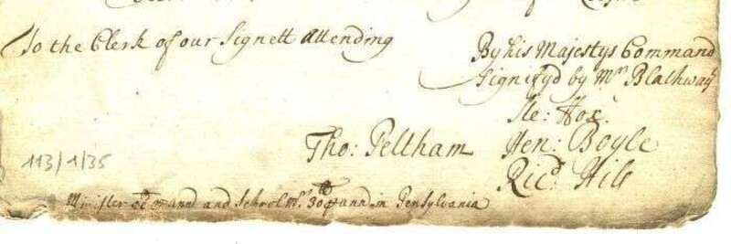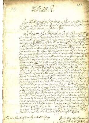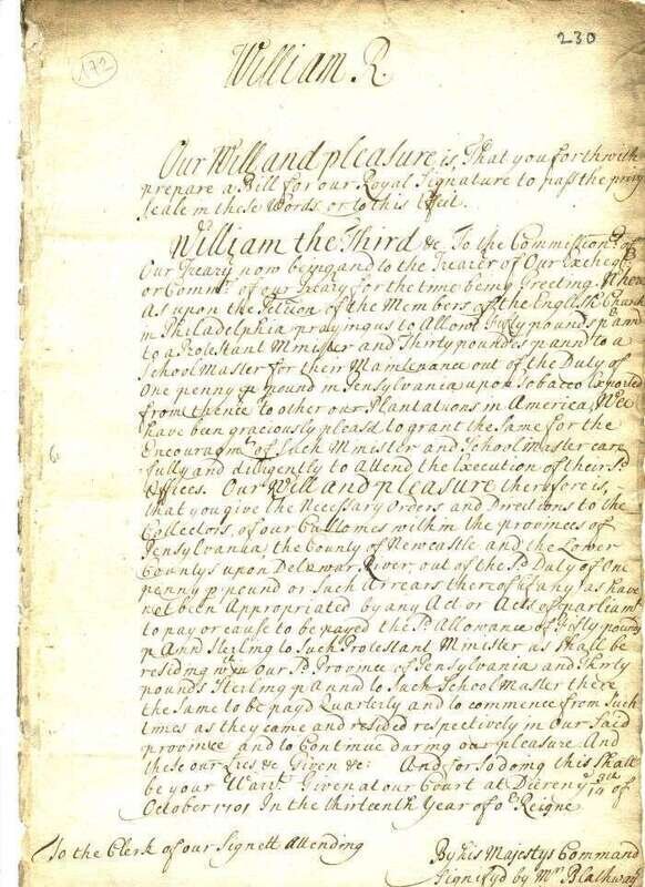 Manuscript Document. William III, King of England. [London: October 14, 1701.] 1 p., folio, approx. 13 x 8 1/2 inches (336 x 216 mm), browned at edges. An act to secure an excise on tobacco exported from Pennsylvania, County New Castle, and the "Lower Counties upon the Delaware", other American colonies to provide funds for a minister and a school teacher in Philadelphia. Contemporary copy, possibly the original order to prepare the official document for the King's signature, "our will and pleasure is that you forthwith prepare a Bill for our royal signature..." The official bill was signed by William III in Holland.