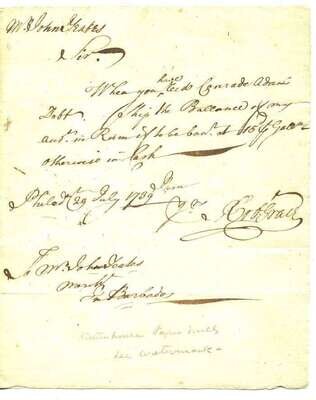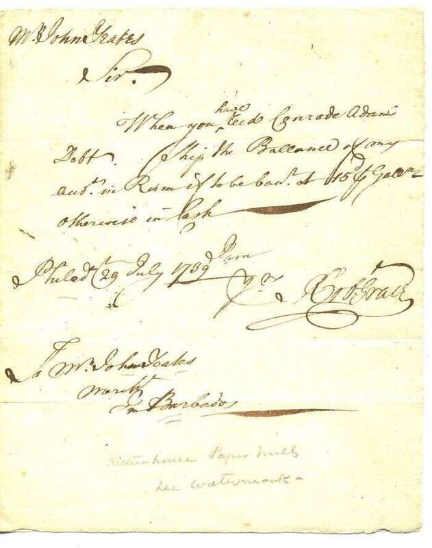 Autograph Letter Signed. Grace, Robert. (Philadelphia), July 29th, 1737. 1 p., sm. 4to, with conjugate leaf, on Rittenhouse Paper Mill paper. Generally clean & clear. To Jasper Yeates, relating to a shipment of rum from Barbados.