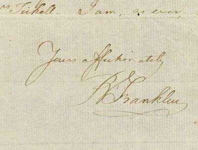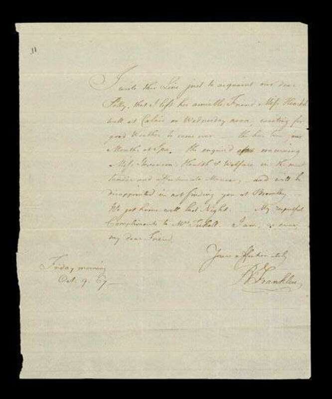 Autograph Letter Signed. Franklin, B[enjamin]. N.p., Oct. 9, [17]67. 1 p, 4to. Clean and clear. To Mary Stevenson [addressed in body as Polly, later Mary Hewson]: "I write this line just to aquaint our dear Polly that I left her amiable friend Miss Henchel well at Calais..." Mary Stevenson, later Mary Hewson, was the daughter of Franklin's London landlady, Margaret Stevenson, with whom he conducted long-lasting intimate and intellectual correspondence.