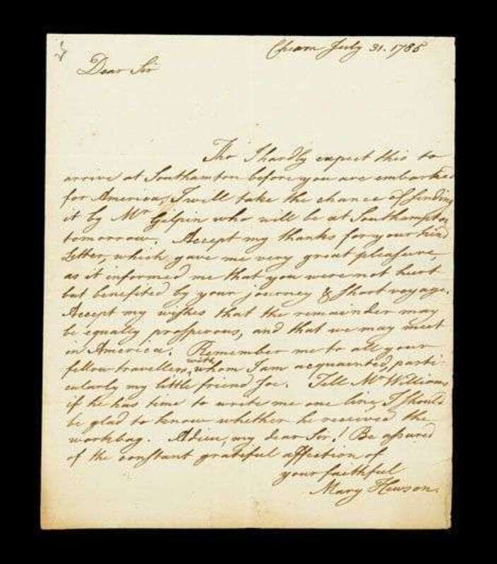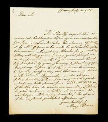 Autograph Letter Signed. Hewson, Mary. July 31, 1785. 1 p., 4to; slightly toned. To Benjamin Franklin, touching on her forthcoming embarkment to America, addressed to Franklin on verso. Mary Stevenson, later Mary Hewson, was the daughter of Franklin's London landlady, Margaret Stevenson, with whom he conducted long-lasting intimate and intellectual correspondence.