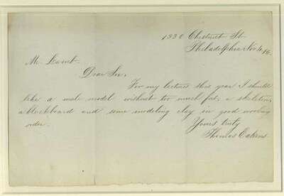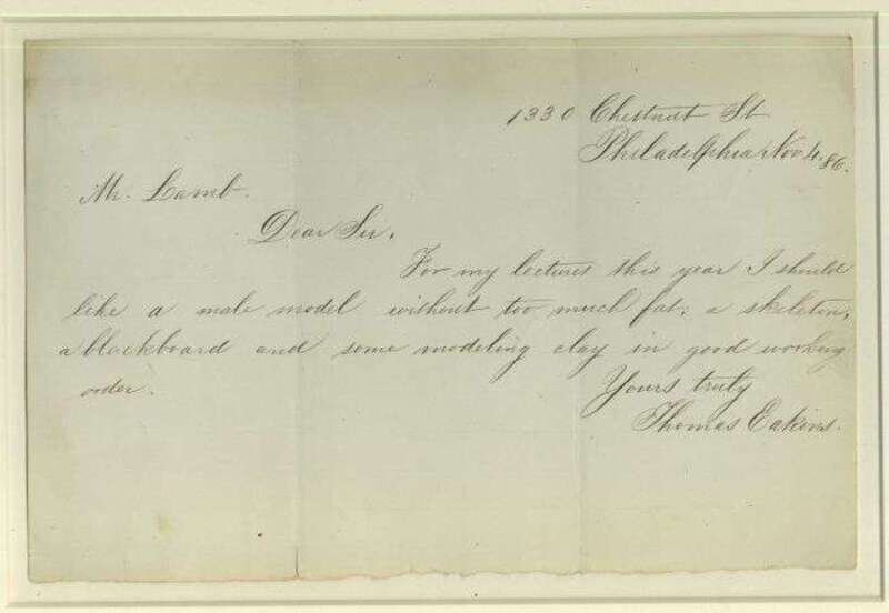 Autograph Letter Signed. Eakins, Thomas. Philadelphia, 1330 Chestnut St., Nov. 4, [18]86. 1 p., oblong 8vo. Clean and clear, framed. "For my lectures this year I should like a male model without too much fat, a skeleton..."