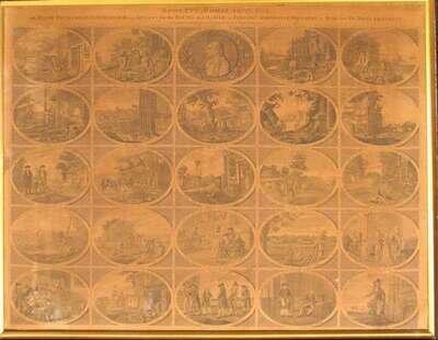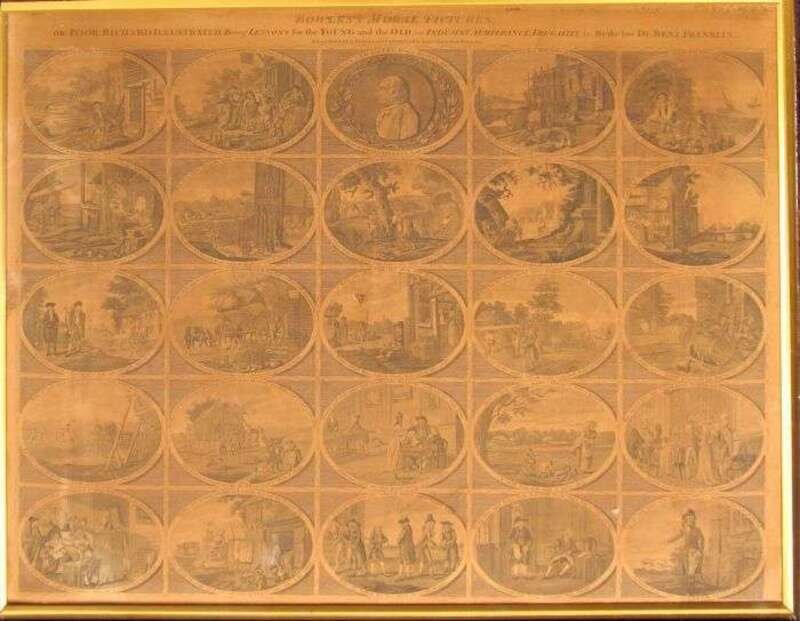 Engraved Canvas-Backed Broadside. (Franklin, Benjamin.) Bowler's Moral Pictures, A Poor Richard Illustrated. Being Lessons for The Young and The Old, On Industry, Temperance, Frugality by The Late Dr. Benjamin Franklin. London: Bowles and Carver, no date [ca. 1796]. 18 3/4 x 24 inches, 476 x 610mm. Rather browned, tear in center panel. Comprising of 25 oval vignettes with maxims.
