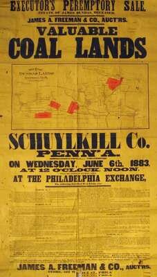 Auction Broadside. James A. Freeman & Co. "Estate of James Dundas. Valuable Coal Lands." Philadelphia, June 6, 1883. 43 x 25 1/4 inches (1090 x 640 mm). Printed on yellow paper. Several close tears extending from edges.
