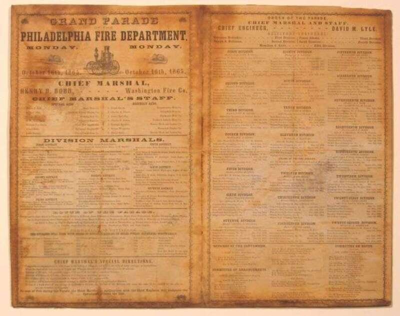 Philadelphia Fire-Fighting Broadside. "Grand Parade of The Philadelphia Fire Department, Monday, October 16th, 1865." [Philadelphia]: A.W. Auner, [1865]. 16 2/3 x 20 1/4 inches; (419 x 514 mm). Mounted on bd. Browned.