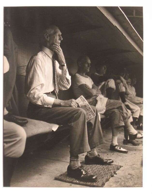 Original Photograph. Halsman, Philippe. "Connie Mack, 1948." Silver print, 13 3/4 x 11 inches (350 x 280 mm). A few small scratches on surface. Connie Mack, holding score card, in the Philadelphia [Baseball] Athletics dugout. Photographer's stamp & title in pencil on verso.