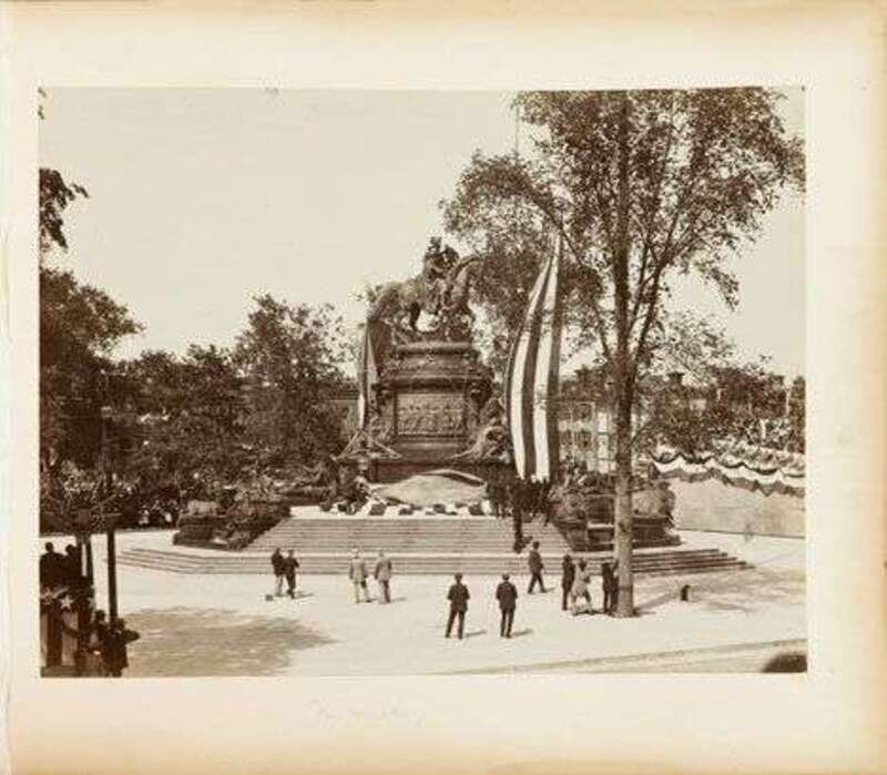 Photo Album. "Dedication of Philadelphia's Washington Monument, Philadelphia, May 13th, 1897." Oblong folio, orig. morocco & cloth; worn and rubbed, spine defective, cover detached. Includes 53 large format - 10 3/8 x 13 3/8 inches (263 x 340 mm) albumen prints of the official proceedings on the streets of Philadelphia, with several documenting President McKinley's attendance; also 9 albumen photo prints, 7 1/2 x 9 1/2 inches (190 x 240 mm) and 27 photo prints, 4 5/6 x 3 1/2 inches (117 x 85 mm), all photos mounted, includes many dark and rich printings of the large format photos.